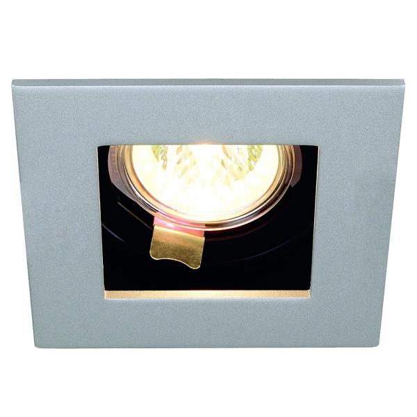 The low-voltage downlight INDI REC 1S is adjustable and designed for use of low-voltage halogen lamps. The silvegrey steel housing is held in black colour on the inside. To operate the downlight a suitable transformer providing 12V alternating current is required. This luminaire is compatible with bulbs of the energy classes: C - A+