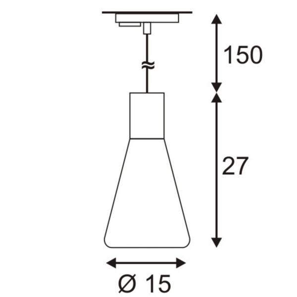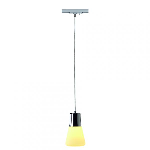 High-voltage pendant luminaire SO-TOO with adapter for the 1-circuit high-voltage track system. The fitting is made from steel with satined glass parts and contains a transparent cable. Due to the incorporated E27 lampholder, LED and energy-saving bulbs are suitable. The pendulum length measures 150cm. This luminaire is compatible with bulbs of the energy classes: A - A+
