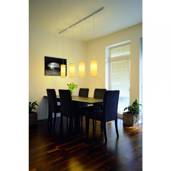 High-voltage pendant luminaire SOPRANA PD-3 with adapter for 1-circuit high-voltage track system. Within the cylindrical lampshade, available in white or beige fabric, the E27 lampholder is already installed. Thus, SOPRANA PD-3 is ready for energy-saving and LED bulbs. The pendulum length measures 150cm. This luminaire is compatible with bulbs of the energy classes: E - A+
