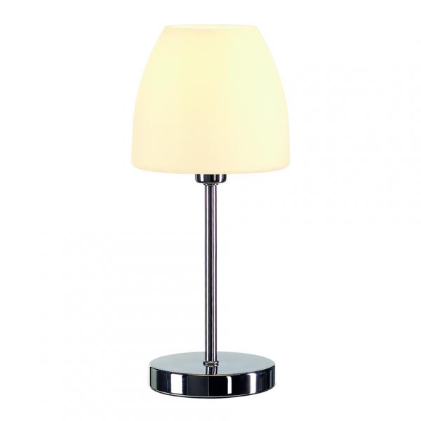 Reduced to the essentials, the RIOTTE SMALL table lamp captivates by its functional design and excellent price-performance ratio. The elegant, chrome-plated steel frame of the fitting reflects the light and creates a beautiful visual effect, while the impressive and solid glass shade with its homogeneous illumination attributes stands for a very warm and cozy ambience. RIOTTE SMALL is supplied ready for direct connection to 230V mains supply via a pre-installed connection lead of 150cm with incorporated switch. This luminaire is compatible with bulbs of the energy classes: E - A+