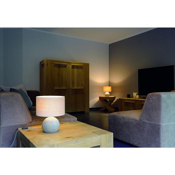 With the SOPRANA SOLID TL-1 table luminaire, we offer a new basic design for residential lighting. The high-quality, grey-beige fabric shade of the SOPRANA series has also been shapely adapted here and mounted onto a concrete-made base. The structure of the SOPRANA SOLID TL-1 is achieved by a special manufacturing process and makes each lamp unicum. Prepared for incandescent or energy-saving lamps with E27 socket, SOPRANA SOLID TL-1 is supplied ready for direct connection to 230V mains supply. A cable with incorporated switch and mains plug is included. This luminaire is compatible with bulbs of the energy classes: E - A+