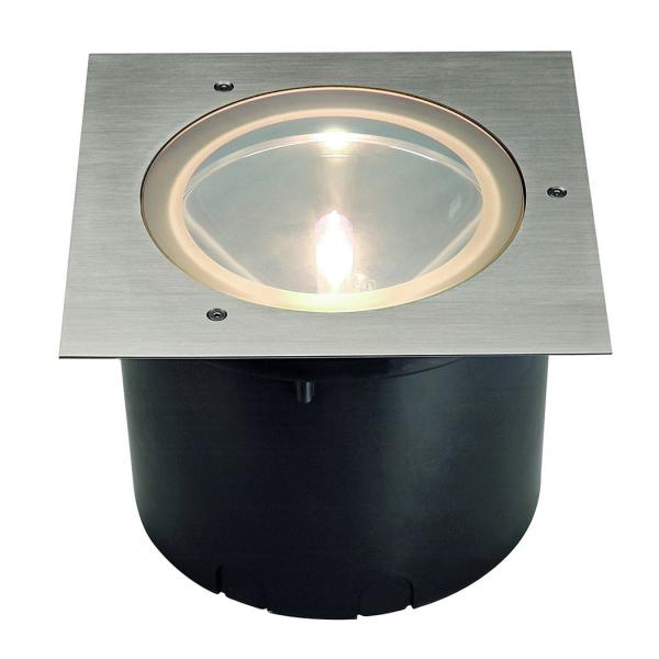 The walkable high-voltage floor luminaire with a rectangular stainless steel cover and partially satined glass is equipped with an adjustable G12 lampholder making it compatible with discharge lamps. Rated IP67 it is suitable for outdoor use. The electrical connection is made directly to 230V mains supply via the incorporated ballast. For simplified mounting, a suitable installation housing is included. Through-wiring is possible. This luminaire is compatible with bulbs of the energy classes: A - A+