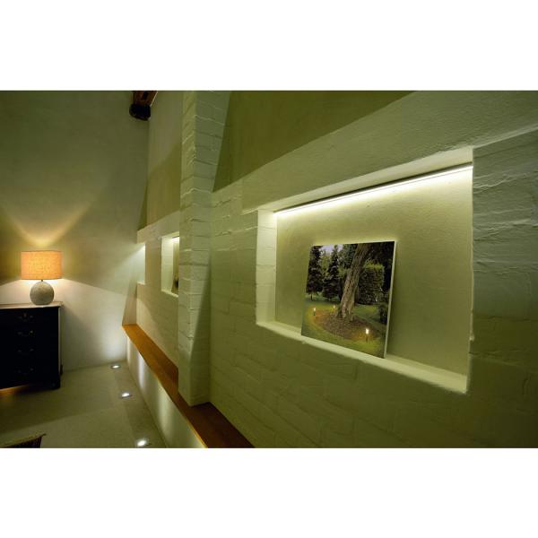 A rigid 24V DC LED RGB profile made from anodized aluminium and plastic. We included a connection lead, a flexible connector and mounting clips. Through the build-in plug-contacts these profiles can be connected directly to each other. The power-input to these profiles, available in several lengths, is made via a separately available 24V direct current power supply. This luminaire contains built-in LED lamps. EEK: A - A++. The lamps cannot be changed in the luminaire. Ref.: 631472 Ref.: 631470 Ref.: 631471 Ref.: 470502