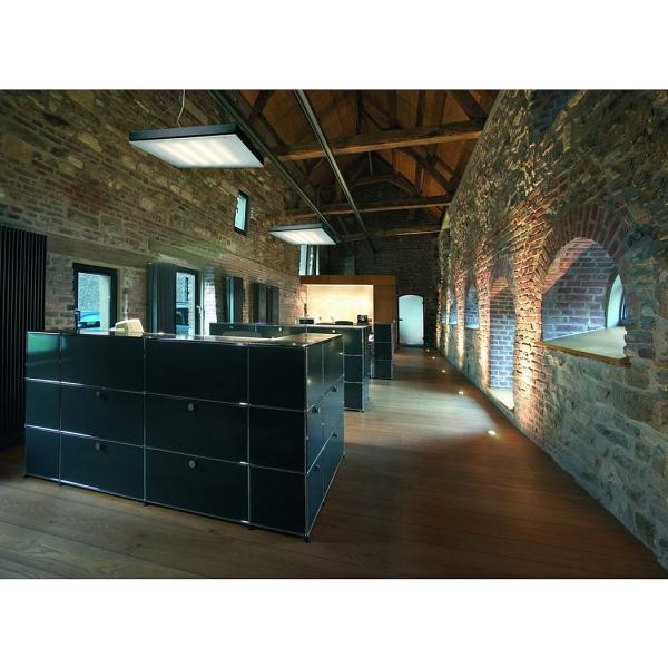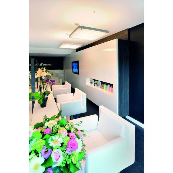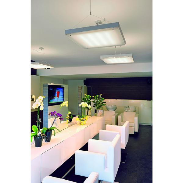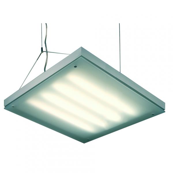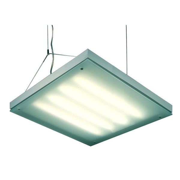 The T5 GRILL UNI pendant lamp is a professional fitting for surface mounting. Behind the frosted acrylic glass, which is mounted on a rectangular, silvergrey or white painted frame, there are four G5 lampholders for T5 fluorescent tubes, providing 24W each. Thanks to the already incorporated electronic ballast, T5 GRILL UNI is ready for direct connection to 230V mains supply. This luminaire is compatible with bulbs of the energy classes: A - A