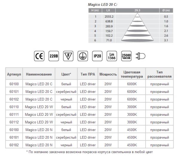 Встраиваемый LED-светильник со светодиодом мощностью 20 Вт. Литой алюминиевый корпус c охлаждающим радиатором. Отражатель из шлифованного алюминия. Рассеиватель из прозрачного стекла. В комплект входит драйвер, светодиод. Оптическая часть выдвигается на угол до 60° от горизонтальной оси и поворачивается на 355° вокруг вертикальной оси.